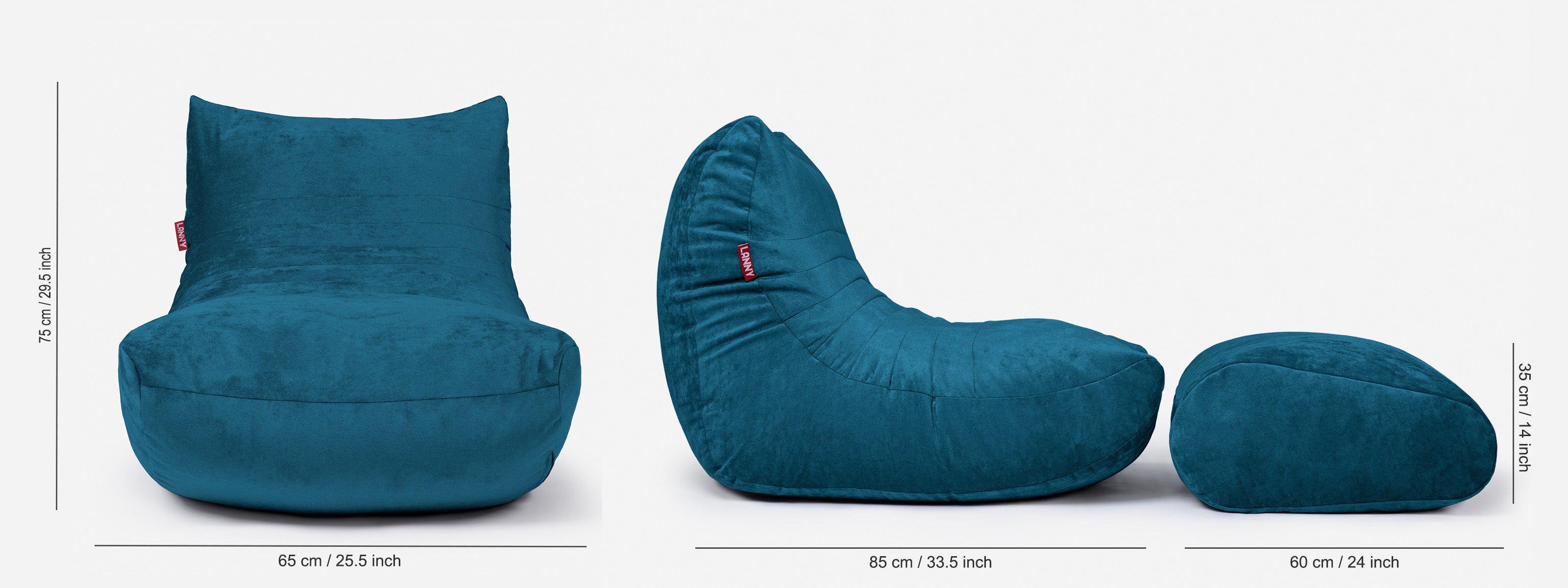 Chair Dimensions: The Curvy Lounger promotes a zero-gravity recline with its deep seat, while the high 75 cm back support ensures total full-body comfort for long periods of lounging. Footrest Dimensions: The comfortable 60 cm footrest elevates your seating experience, providing comprehensive Leg support and serving as a key component of this 2-piece Bean bag Chair set.
