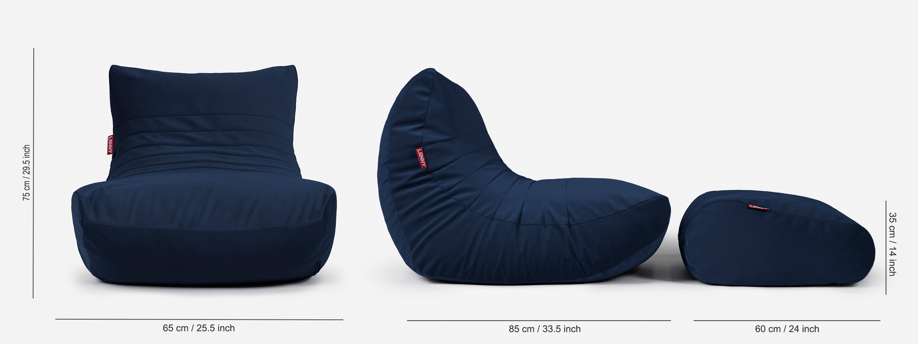 Chair Dimensions: The Curvy Lounger promotes a zero-gravity recline with its deep seat, while the high 75 cm back support ensures total full-body comfort for long periods of lounging. Footrest Dimensions: The comfortable 60 cm footrest elevates your seating experience, providing comprehensive Leg support and serving as a key component of this 2-piece Bean bag Chair set.