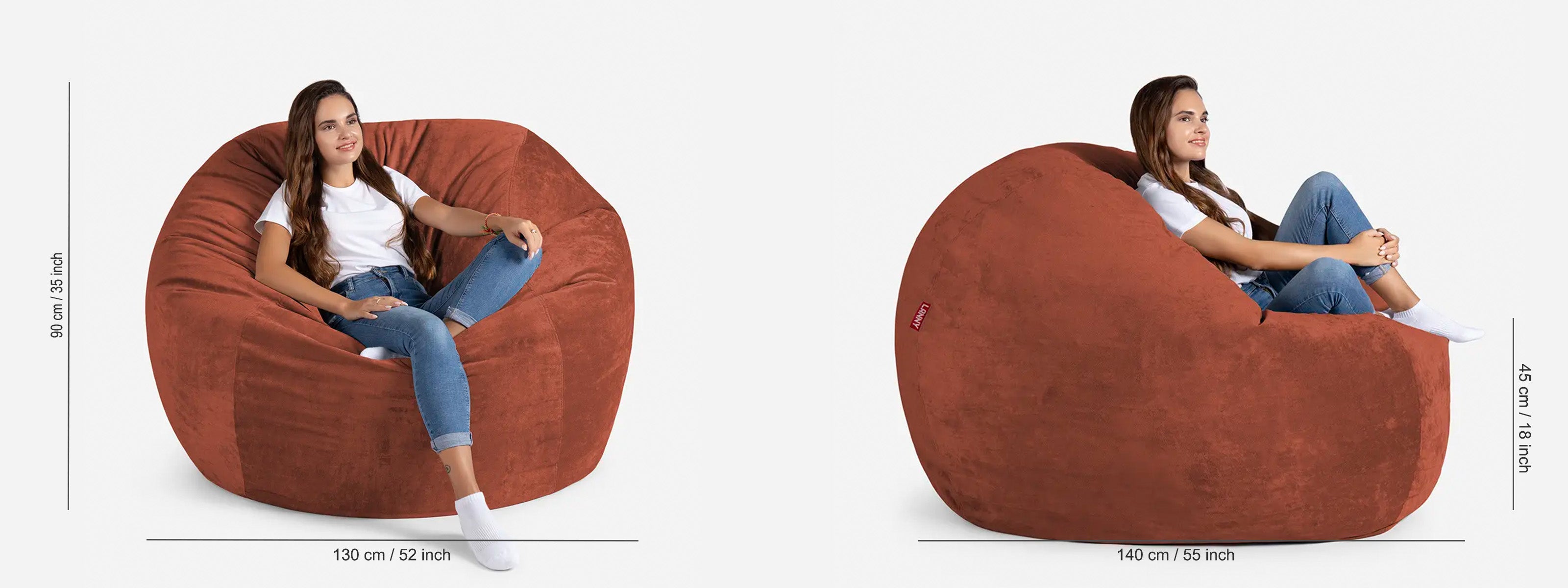 Oversized Bean Bag Dimensions: 130 cm, Width 140 cm Depth, supportive 90 cm Back Height, comfortable 45 cm Seating Height