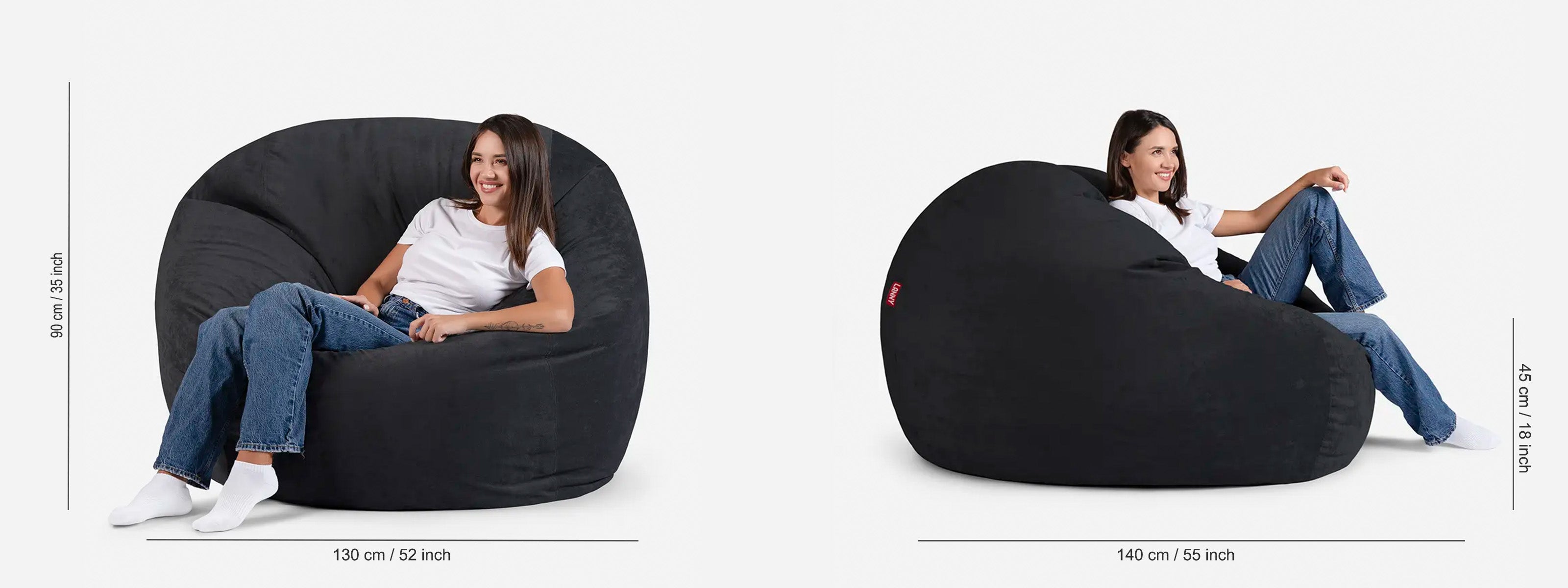 Oversized Bean Bag Dimensions: 130 cm, Width 140 cm Depth, supportive 90 cm Back Height, comfortable 45 cm Seating Height Ideal Use: Adults (Tall & Large Frame), Lounge Seating, Posture Support