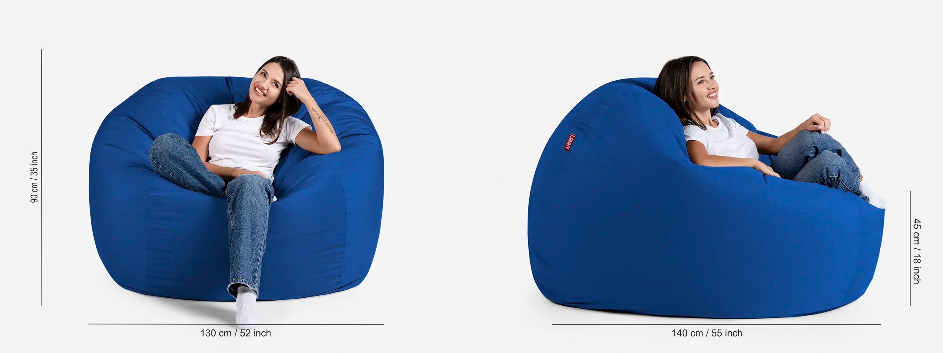 Oversized Bean Bag Dimensions: 130 cm, Width 140 cm Depth, supportive 90 cm Back Height, comfortable 45 cm Seating Height Ideal Use: Adults (Tall & Large Frame), Lounge Seating, Posture Support