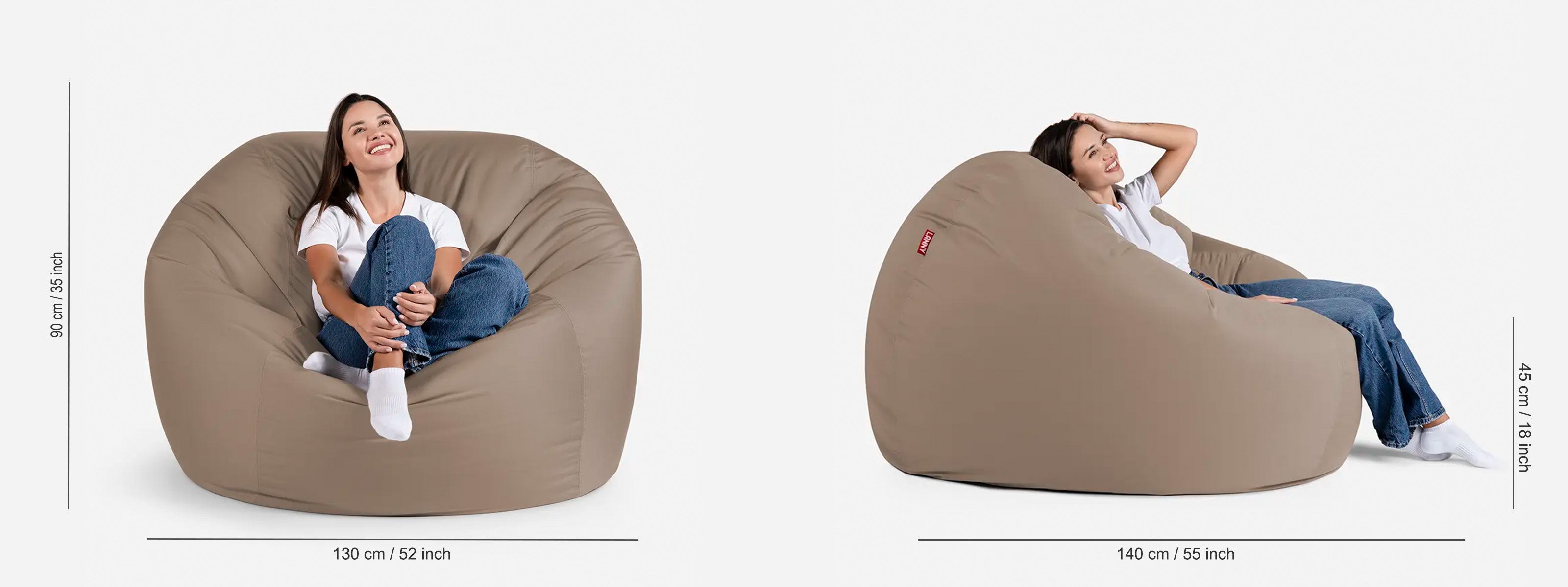 Oversized Bean Bag Dimensions: 130 cm, Width 140 cm Depth, supportive 90 cm Back Height, comfortable 45 cm Seating Height Ideal Use: Adults (Tall & Large Frame), Lounge Seating, Posture Support