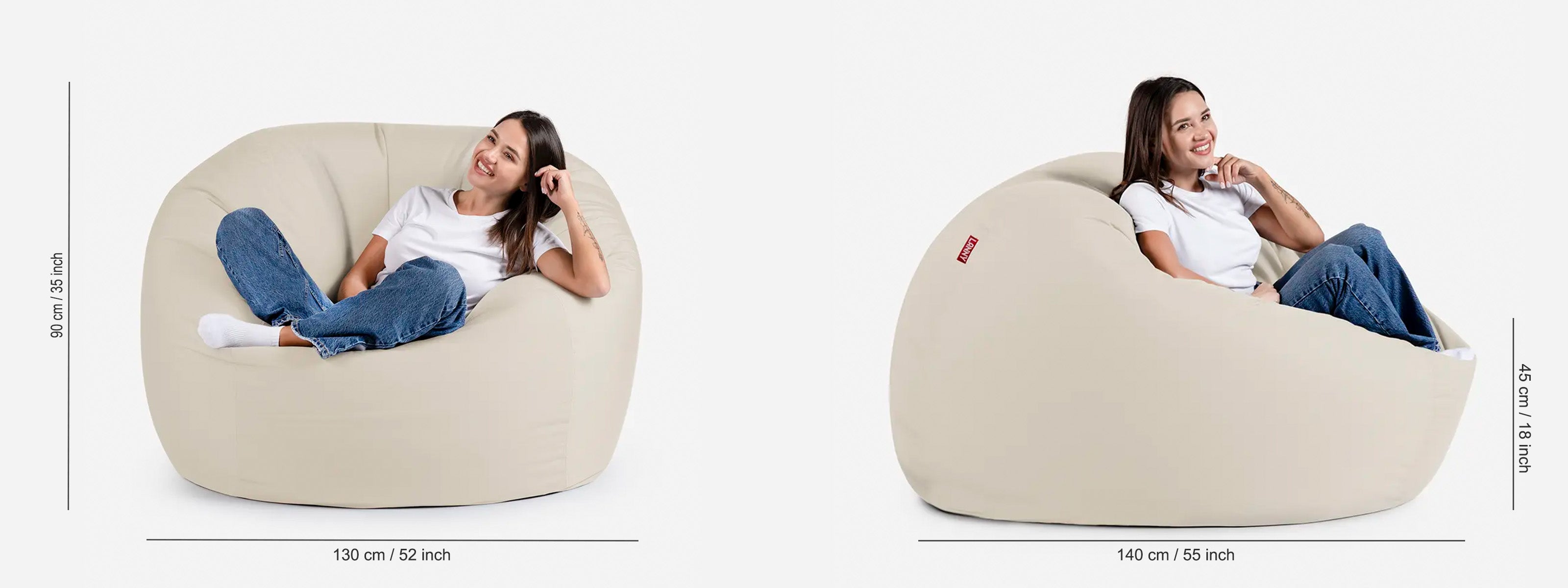 Oversized Bean Bag Dimensions: 130 cm, Width 140 cm Depth, supportive 90 cm Back Height, comfortable 45 cm Seating Height Ideal Use: Adults (Tall & Large Frame), Lounge Seating, Posture Support