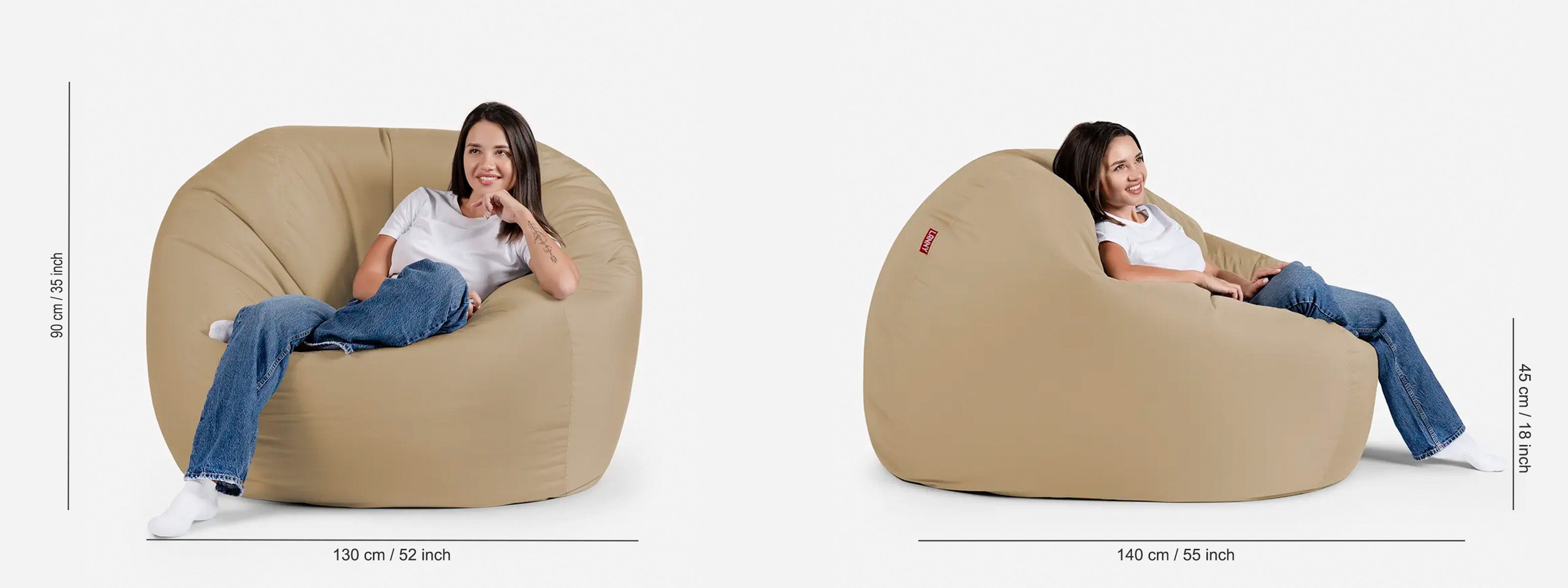 Oversized Bean Bag Dimensions: 130 cm, Width 140 cm Depth, supportive 90 cm Back Height, comfortable 45 cm Seating Height Ideal Use: Adults (Tall & Large Frame), Lounge Seating, Posture Support