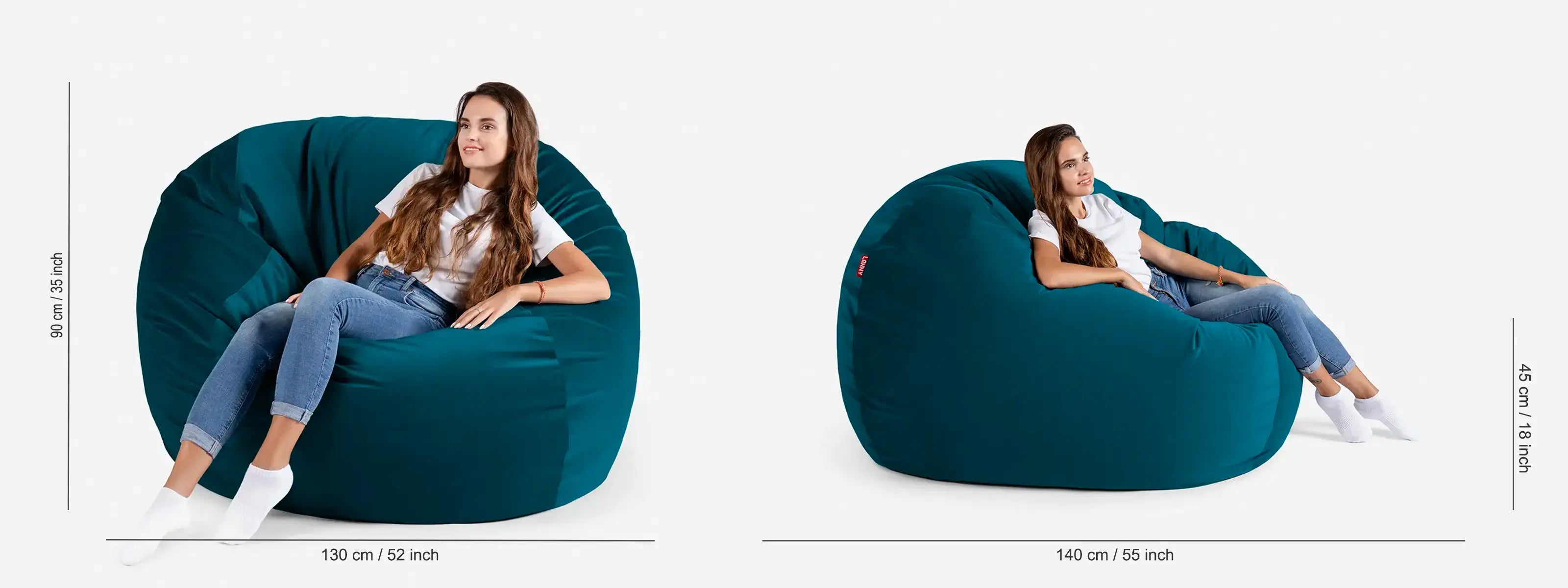 Oversized Bean Bag Dimensions: 130 cm, Width 140 cm Depth, supportive 90 cm Back Height, comfortable 45 cm Seating Height