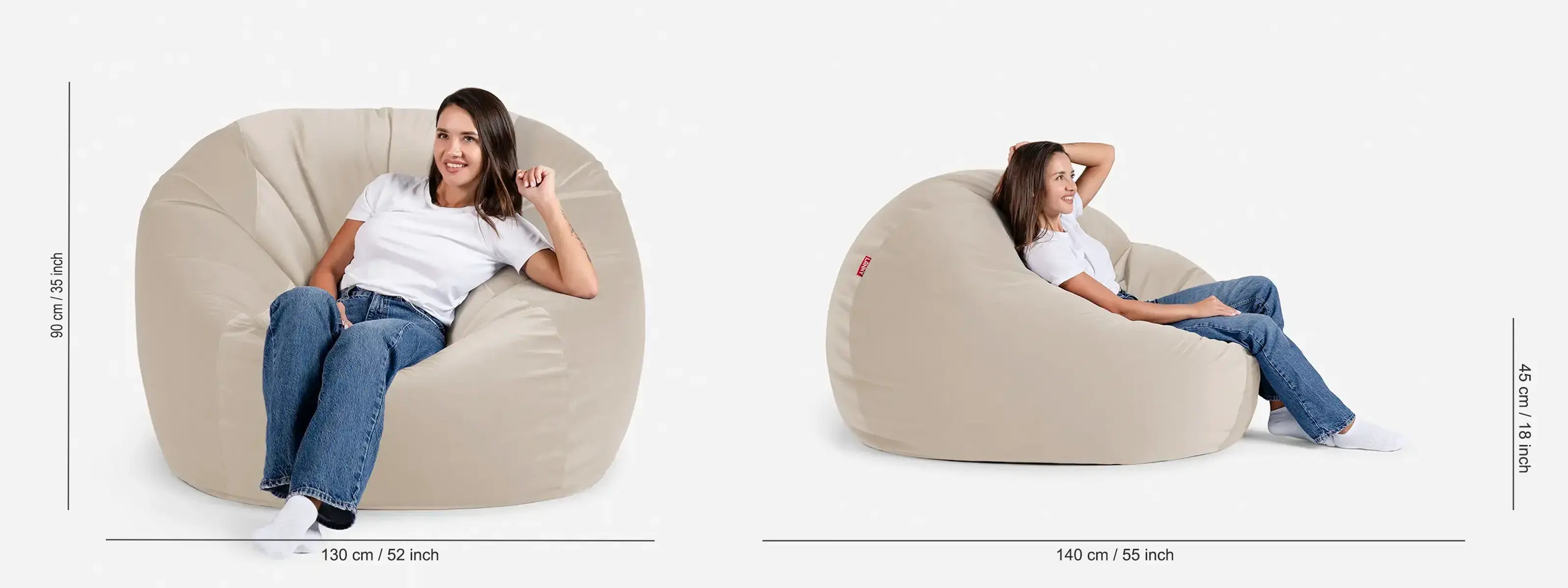 Oversized Bean Bag Dimensions: 130 cm, Width 140 cm Depth, supportive 90 cm Back Height, comfortable 45 cm Seating Height