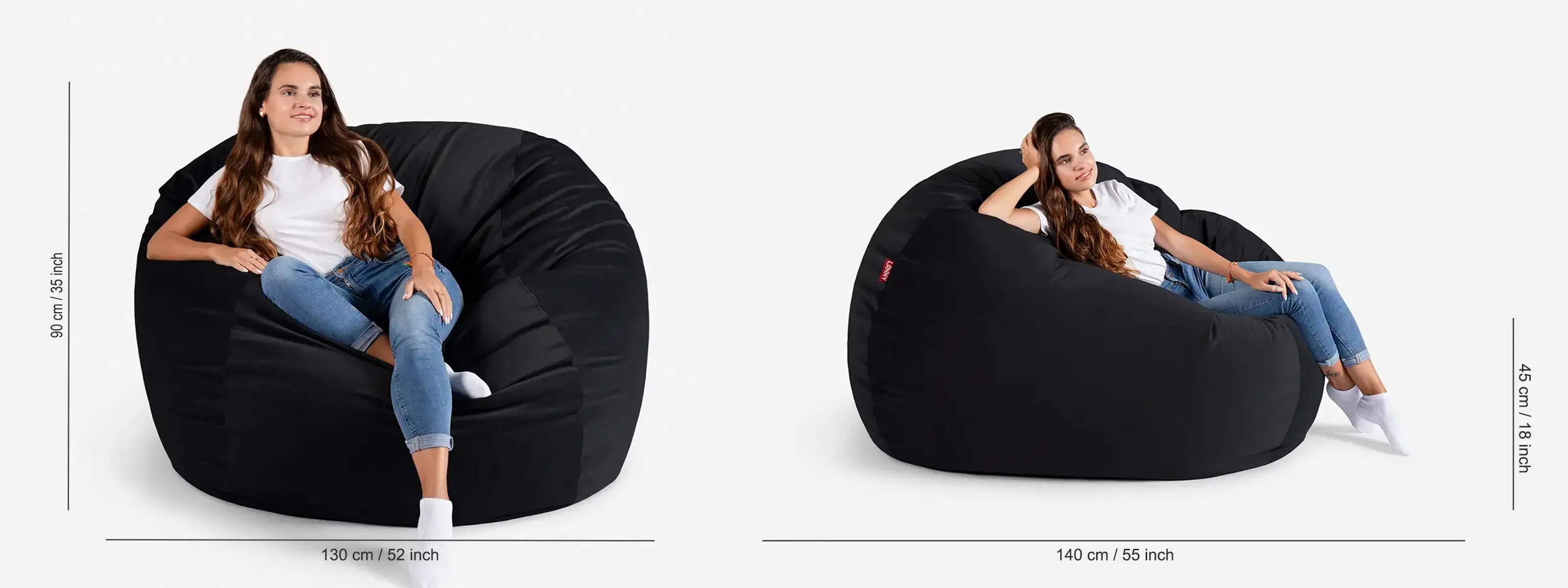 Oversized Bean Bag Dimensions: 130 cm, Width 140 cm Depth, supportive 90 cm Back Height, comfortable 45 cm Seating Height