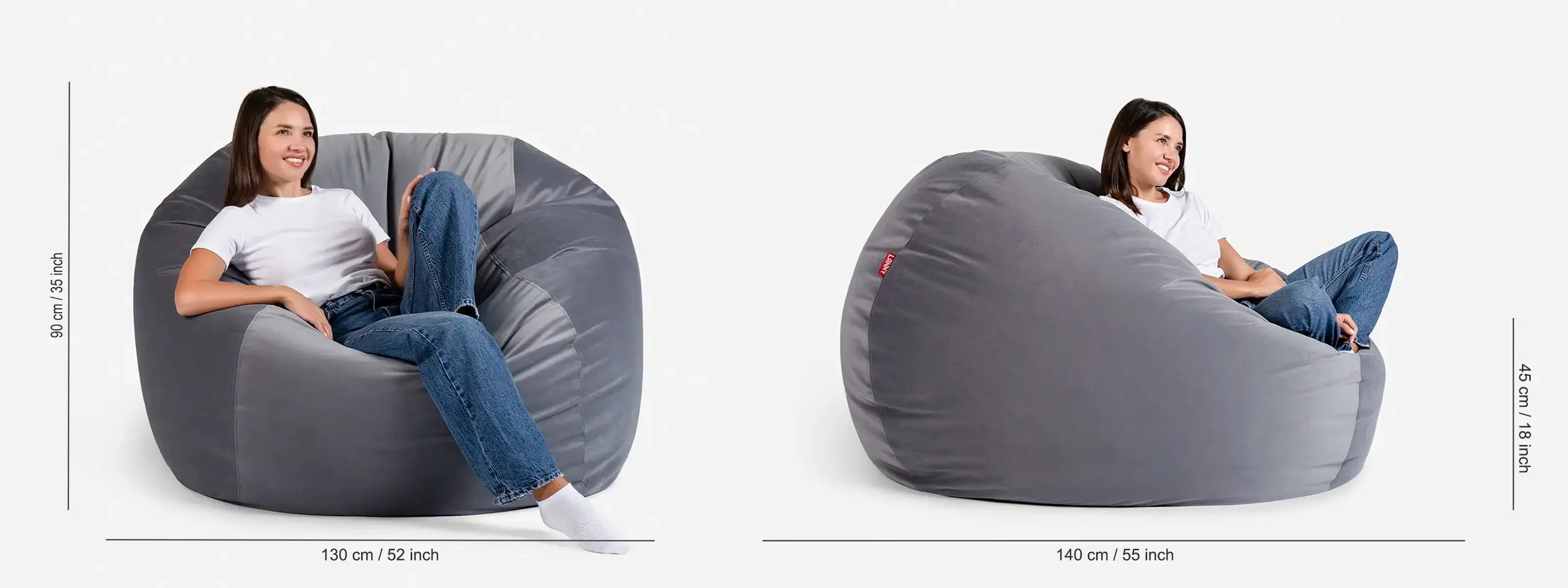 Oversized Bean Bag Dimensions: 130 cm, Width 140 cm Depth, supportive 90 cm Back Height, comfortable 45 cm Seating Height